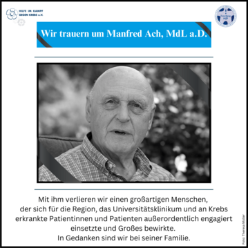 Unsere Stiftungsratvorsitzende, Gabriele Nelkenstock, denkt voller Dankbarkeit an die Erfolgsgeschichte „Aktion Stammzelltherapie“. Mit einer Anschubfinanzierung von 500.000 Euro durch die Bürgerinnen und Bürger in der Region ermöglichte die Politik, namentlich der bayerische Landtagsabgeordnete Manfred Ach, den Bau eines Stammzellzentrums am Universitätsklinikum Würzburg - UKW. Es war ein großartiges Beispiel, was Politik und Gesellschaft gemeinsam für Menschen bewegen können. Wir werden diesen großartigen Menschen und Politiker Manfred Ach nie vergessen. In Gedanken sind wir bei seiner Familie.